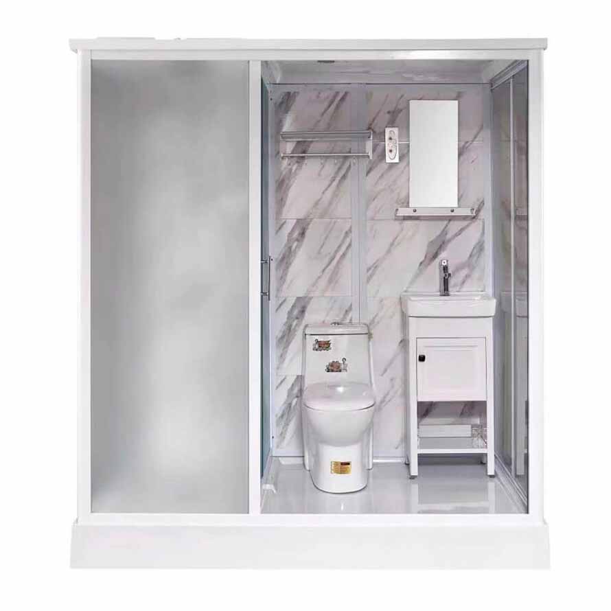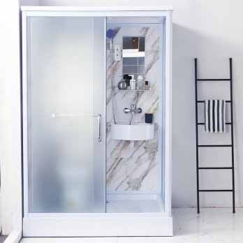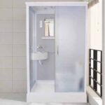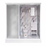 It is a “ready to use” delivery, with integrated basin, wash basin, shower and all of the required accessories. Plumbing and electrical are installed and you only need to do a simple assembly. It is an ideal choice for bathroom renovations and can also be placed at your house as a second utility bathroom. Material is 100% waterproof pvc, has a tile look effect and is not inferior to conventional bathrooms. Its exterior cladding can be either sandblasted glass or bamboo.